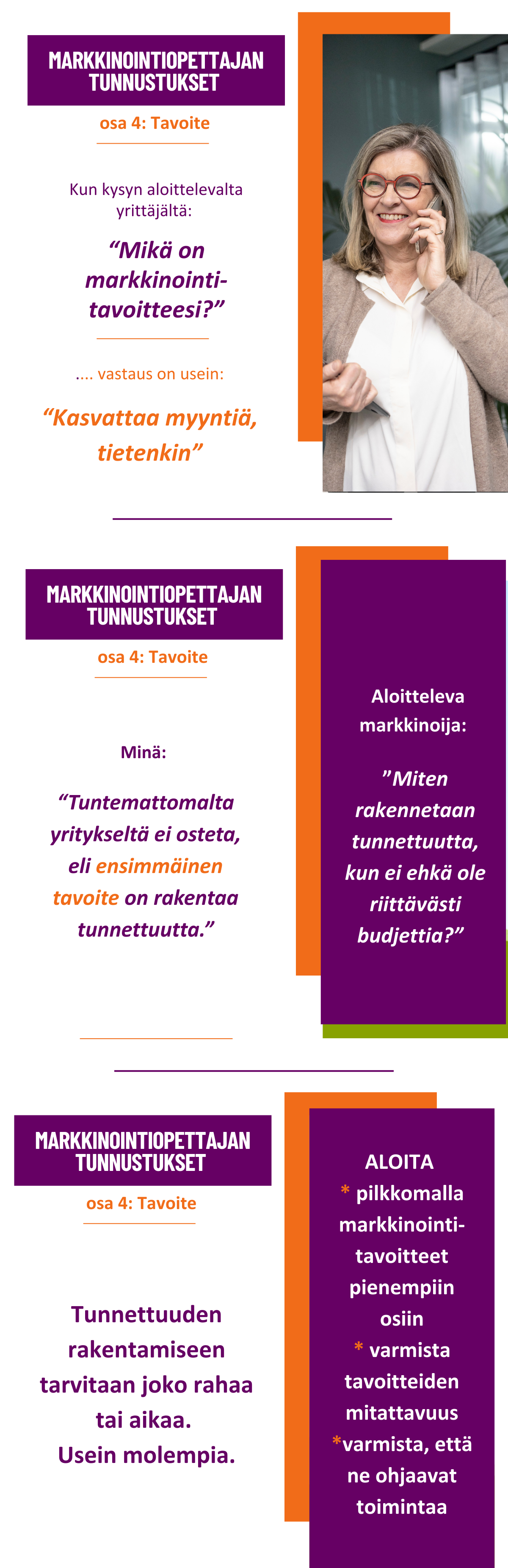 OSA 4 – Jaa markkinointiTAVOITTEET pienemmiksi, konkreettisiksi osatavoitteiksi, jolloin ne ohjaavat tekemistä ja niitä voidaan mitata