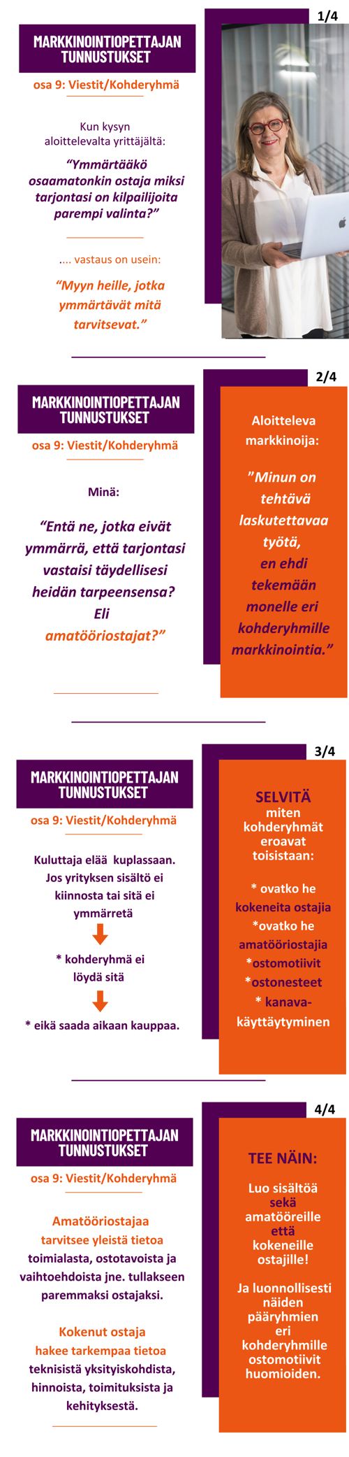 Viestejä ja sanomia on oltava kaikille kohderyhmille, joille haluat myydä. Niistä asioista ja niissä kanavissa, joissa kohderyhmä liikkuu.