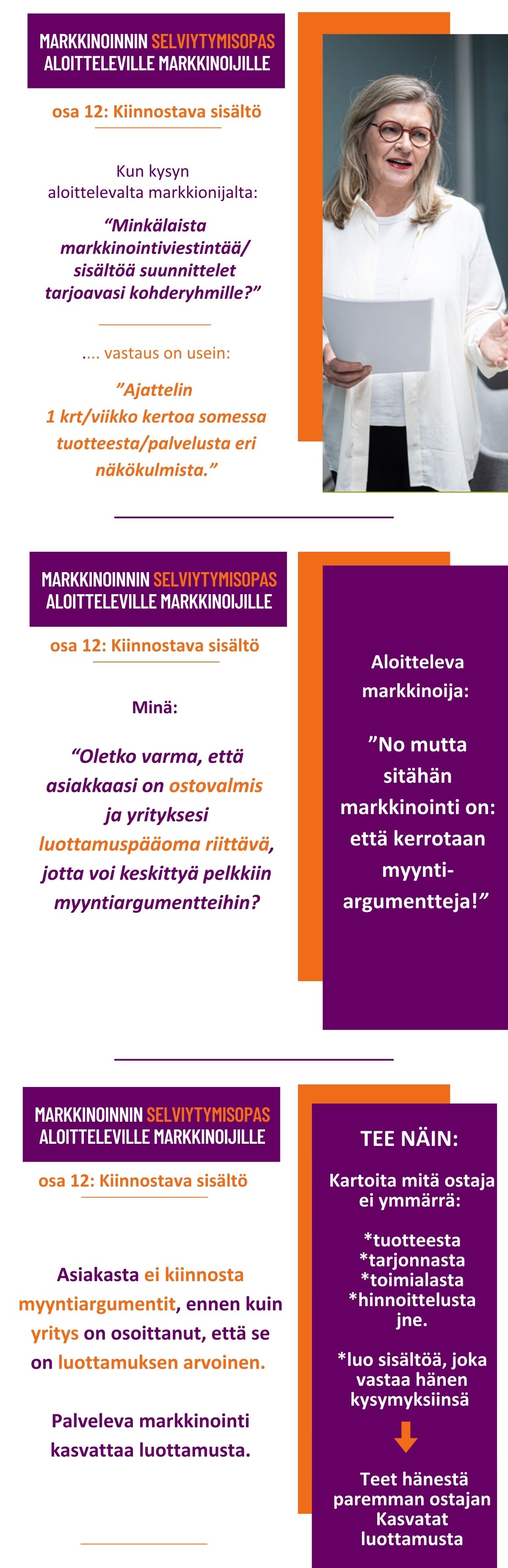 Meidän on yrityksenä tuotava esiin asioita, jotka hyödyntävät kohderyhmää ja tekevät heistä parempia ostajia. Potentiaalisia asiakkaita on esimerkiksi autettava ymmärtämään miten he voivat määritellä tarpeensa, millainen toimiala on, mitä pitää ymmärtää, kun ostaa tuotetta/palvelua tältä toimialalta, miten tunnistetaan hyvä palveluntarjoaja, millainen on toimialan hintataso jne.